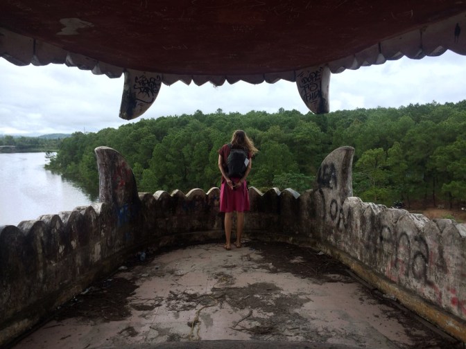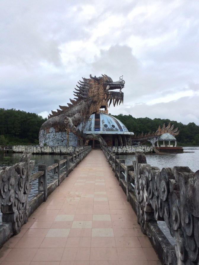 Learning historical things in Hue turned out to be expensive, so instead we used our bike to cruise around the outsides of what I am sure was a lovely fort and royal palace. We saved some cash and maybe had a better time sitting in the park watching the Vietnamese practice physical fitness, with exercises ranging from tai chi to aerobics to ball room dancing, all performed with an astounding lack of grace and an equal lack of shame. In an effort not to be total dirtbags we drove out to the free Thien Mu Pagoda and Museum, a beautiful ride alongside the river with roofs of pagodas rising out of the forest surrounding us. Later that same day we drove just outside the city to poke around an abandoned water park, rumored to now have crocodiles lurking in the algae-covered pools.