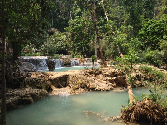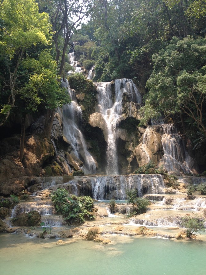 The next day I met up with one of my favorite travel buddies and two of her friends, all fresh from Oakland. After checking out the sunset from the top of Phou Si Hill, we stopped by the night market. Laotians in general seemed pretty indifferent to the farangs in their midst, making for probably the most pleasant market experience I’ve had in Asia, able to freely browse at my own relaxed pace. Another day was spent visiting the Kuang Si Waterfall, hiking alongside layers of milky blue pools to the dramatically cascading falls. Because we were having such a nice time, we decided to keep cruising on what wound up being an accidental 10km loop to a natural spring for a beer and a swim. We played on swings and a natural slack line of sorts, before at last forcing ourselves to head back to our impatiently waiting tuk tuk driver.